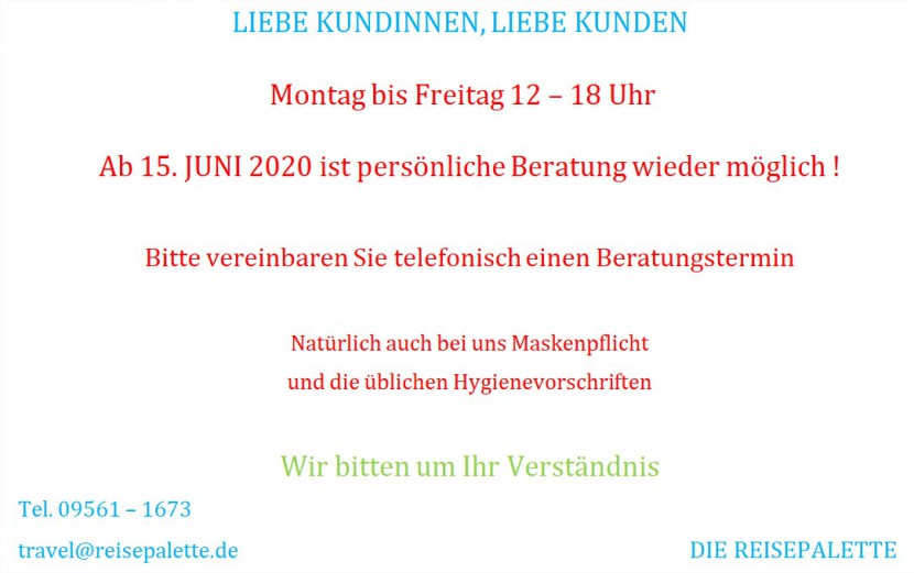 Bitte vereinbaren Sie vorab telefonisch einen Termin für Ihren neuen Urlaub.